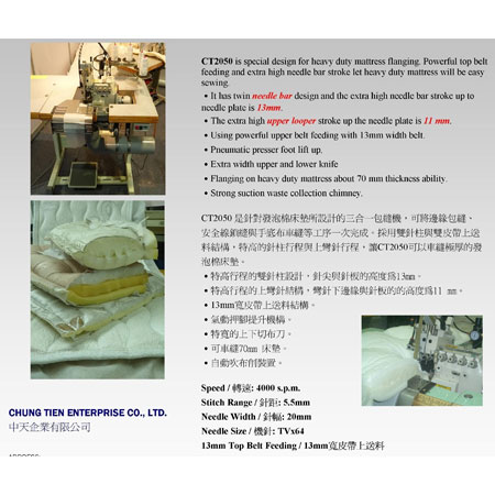 Chung Tien Enterprise Co., Ltd. specializes in Manufacturer, Supplier and Exporter Bedding Machine, with a factory in Taiwan. It has always been our focus to manufacture finest products and to deliver them on time with attentive after-sales service. Our innovative spirit enables us to stay a step ahead of our competitors by providing the widest range products. Enquiries from global wholesalers, Distributors, buyers, agents and OEM/ODM are welcome.
