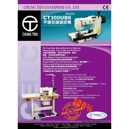 Eine der meistverkauften Nähmaschinen ist der CTEC Tape Edge Sewing Head. Der CT 300UB5 Tape Edge-Nähkopf ist zu 100% nach dem Original 300UX5 Tape Edge von Singer gefertigt. Wie die anderen 300 U- und 300 W-Maschinen von CTEC wird auch jedes einzelne Teil einschließlich Karosserie und Sockel zu 100% in Taiwan unter strenger Qualitätskontrolle hergestellt. Die Qualität der Maschinen ist garantiert. Wir haben das Feedback vieler Kunden verdient und verbessern es ständig. Kunden verwenden die Original Singer 300UX5-Maschine, die sie mit unseren CT 300UB5-Maschinen austauschen kann.