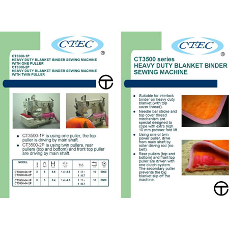 CTEC จัดหาเครื่องนอนหลายชนิดรวมถึง CT300UB5 Tape Edge Sewing Head; เครื่อง CT300UB6 แบนขอบเทป; CT2000 / CT2050 เครื่องจับเจ่าสำหรับที่นอน; จักรเย็บผ้าเข้าเล่มรุ่น CT3500 และเครื่องเย็บตะเข็บลูกโซ่สำหรับงานหนักรุ่นแบนเตียง CT3503 โปรดดูข้อมูลด้านล่างและหากมีคำถามใด ๆ โปรดแจ้งให้เราทราบ